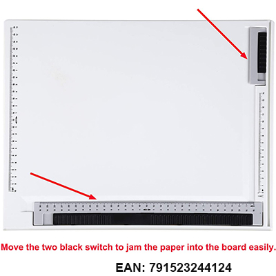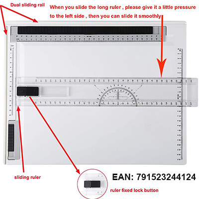 1.The A4 Drawing Board comes with Metric System. The board outsize size is 38x30cm and its inner sheet size is 35x27cm.. The drawing board is made of unbreakable Acrylic material for durability and the drawing surface is very stable and solid for any design project. 2.The parallel straightedge with STOP and GO locking/unlocking action guides your drafting precisely. Dual rail system is handy for ensuring straight lines, as well as clamping the paper securely in place. And the board is marked in centimeters on both edges. 3.On the drawing surface there are two options for secure fixation of the sheet, which can also be operated well with one hand. This is especially important for completing a title block, as all letters are on an imaginary line.Once the sheet has been clamped and the rail has been inserted, nothing wobbles on the sheet, so you can work properly. 4.The long straightedge design allows drawing along the top edge of the straight edge right down to the bottom of the sheet, with full accuracy and stability. And the triangle ruler and angle ruler are all equipped with slot so that it can be moved left and right on the long parallel ruler. 5.Packet contents: A4 drawing board x1, sliding set square with Protractor x1, sliding straightedge with protractor x1, rotating T-square with protractor x1.